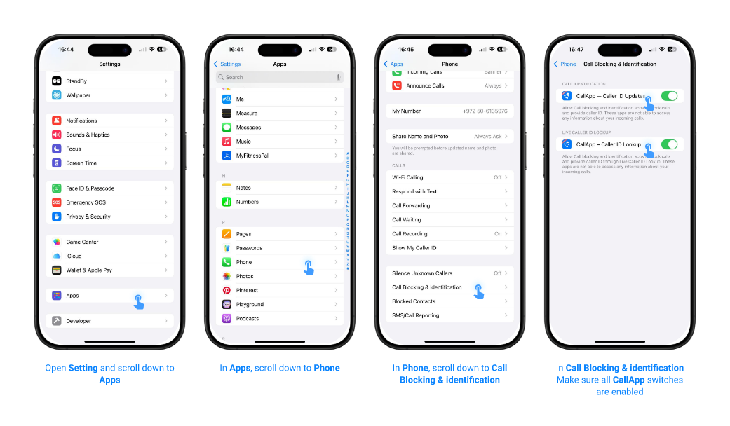 Go to iPhone Settings → Apps → Phone → Call Blocking & Identification and enable all CallApp switches.
